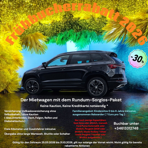 Sie benötigen einen Mietwagen für ihre Urlaubszeit ? Sie haben keine Lust auf endlose Schlangen am Schalter, Fragerei, Diskussionen wegen Zusatzversicherungen oder hohe Kautionen? Dann sind Sie Ihr bei uns genau richtig. Wir erledigen alles für Euch und stellen euren Mietwagen direkt nach der Ankunft bereit, sodass Ihr entspannt in euren Urlaub starten könnt.